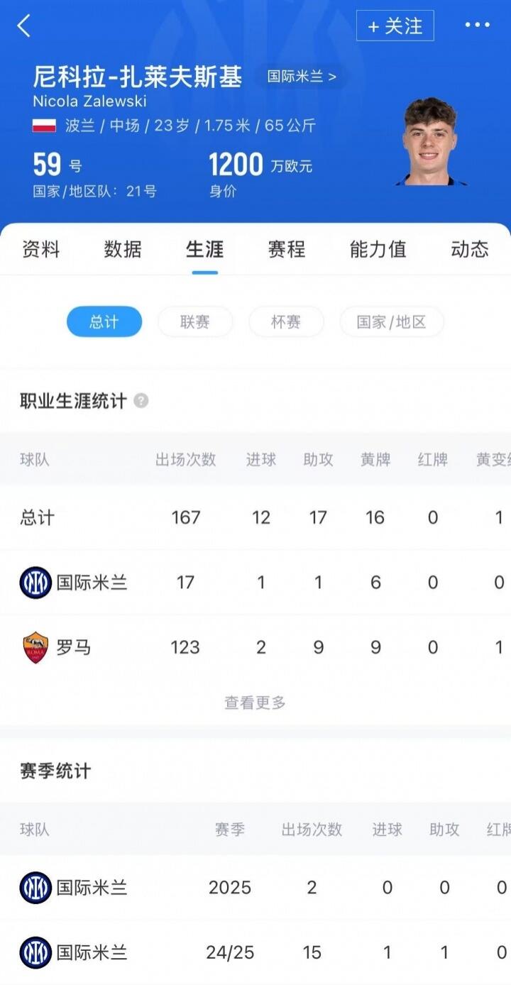 扎莱夫斯基现年23岁,波兰中场,上赛季代表国米各赛事出场15次,贡献1球1助,目前球员德转身价为1200万欧元。